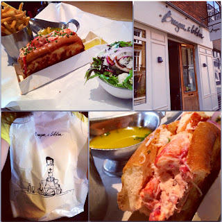 ещё не много. В 12:20 меня усадили за столик и, надо сказать, ресторан был забит полностью. Что я хотела съесть, я знала ещё задолго до того, как туда попала, поэтому с заказом я не тянула. Это не мог быть бургер однозначно, потому что такое я стараюсь не есть (сначала написала "вообще не ем", но исправила, ибо зарекаться, как известно, нельзя, а кто знает, может, меня как-нибудь потянет на такое). Ещё в Киеве я раздумывала и выбирала между лобстером и лобстер роллом. Остановилась всё-таки на последнем: по сути, обычных лобстеров я ела, приготовлены они были отлично, поэтому что такого сверхъестественного могли подать здесь? А вот лобстер ролл - это ноу-хау, как мне кажется. Я нигде не видела и даже не слышала о подобном. Заказ принесли ровно через 3 минуты! Видимо, у них там конвейерное производство. Предложили слюнявчик;) Очень удачно! Знали, кому предлагать. Потому что есть аккуратно - это не по моей части. Мне нужно, чтобы после трапезы и вся моя одежда, и скатерть обязательно были в пятнах.