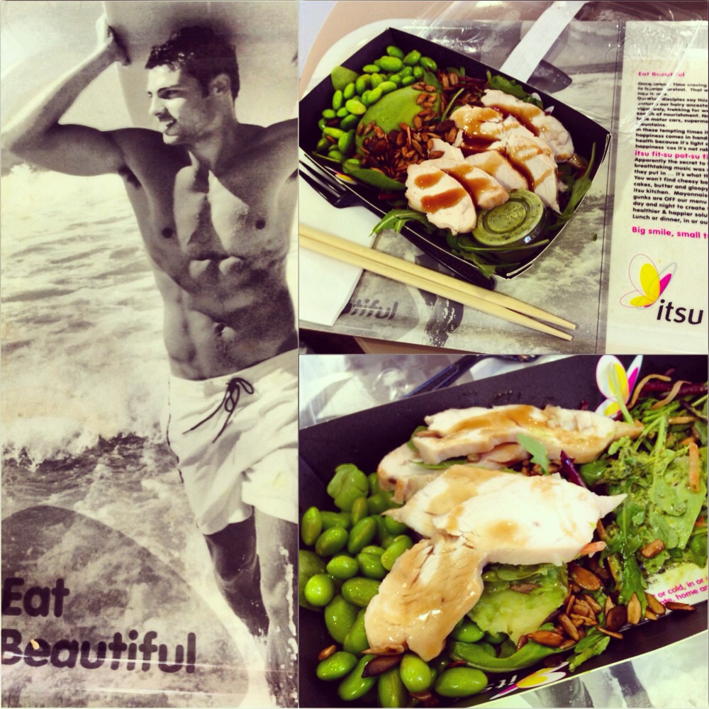 Неожиданно нашла неподалёку обалденный открытый торговый центр (не знаю, как назвать это по-другому... Что-то вроде shopping&fun area). Там кинотеатр, магазины и куча кафешек. Открыла для себя прекраснейшее место - "Itsu". Теперь, думаю, пока не надоест, буду обедать только там! Просто супер! Выбор огромный - в основном - суши/роллы, а ещё салаты в лаваше и без, фрукты, рыба, курица, лапша, супы, замороженный йогурт и т.д. Очень забавные подносы - полуголый мужчина с прекрасным телом. Специально и для девушек, и для мужчин: "Посмотри на него и перестань жрать" (извините, ненавижу это слово, но сейчас оно уместней всего). Это как есть перед зеркалом - так же неловко.